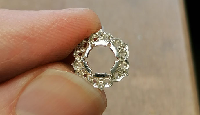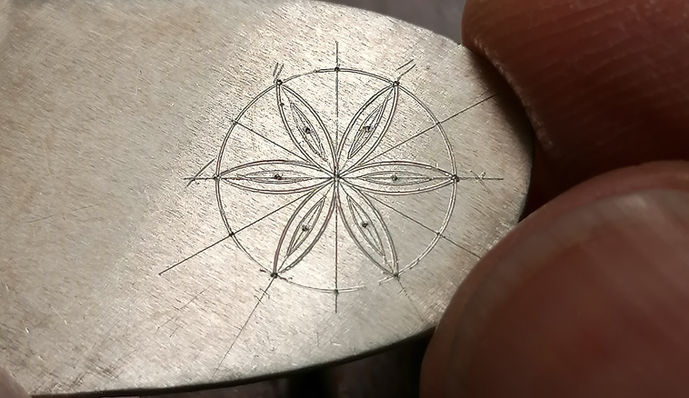 Fabrication d'une somptueuse bague Mandala et fleur de vie, sertie d'une superbe Topaze bleu Londres de 6mm taillée sur mesure en France.